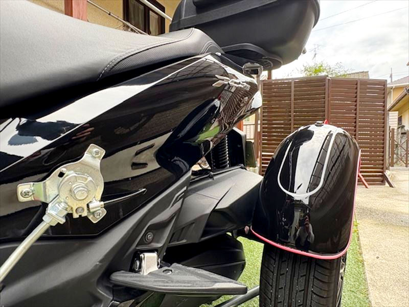 このバイクはマフラーが邪魔でメンテナンススタンドで起こせないので