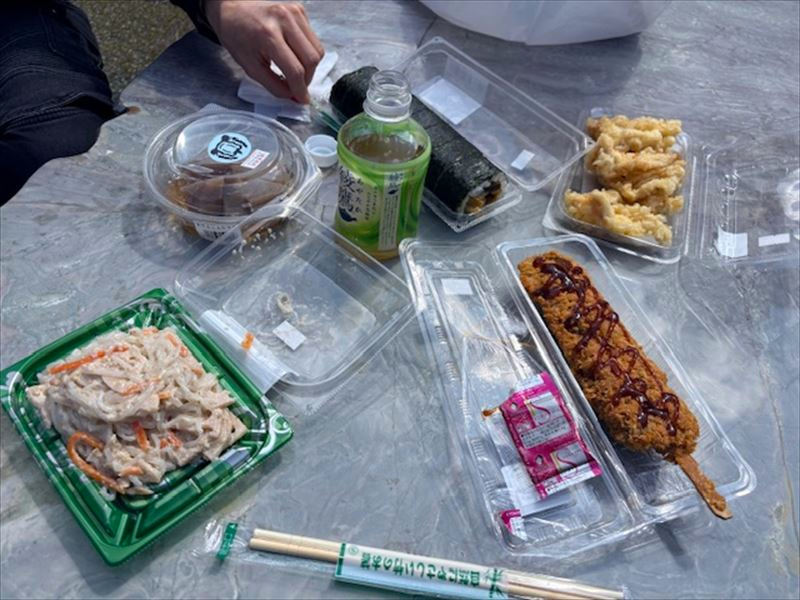 巻きずしやおかずを買って、外のベンチへ